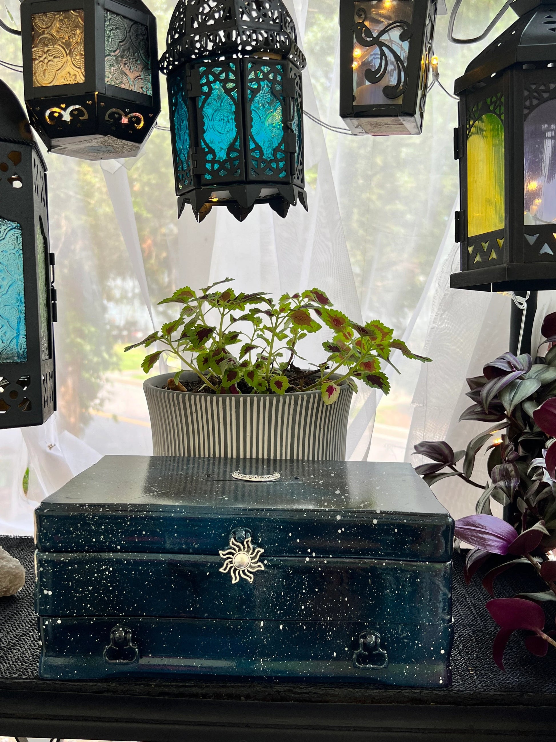 Leda's box features original interior felt, one pull out drawer, and jewelry organizer on top.