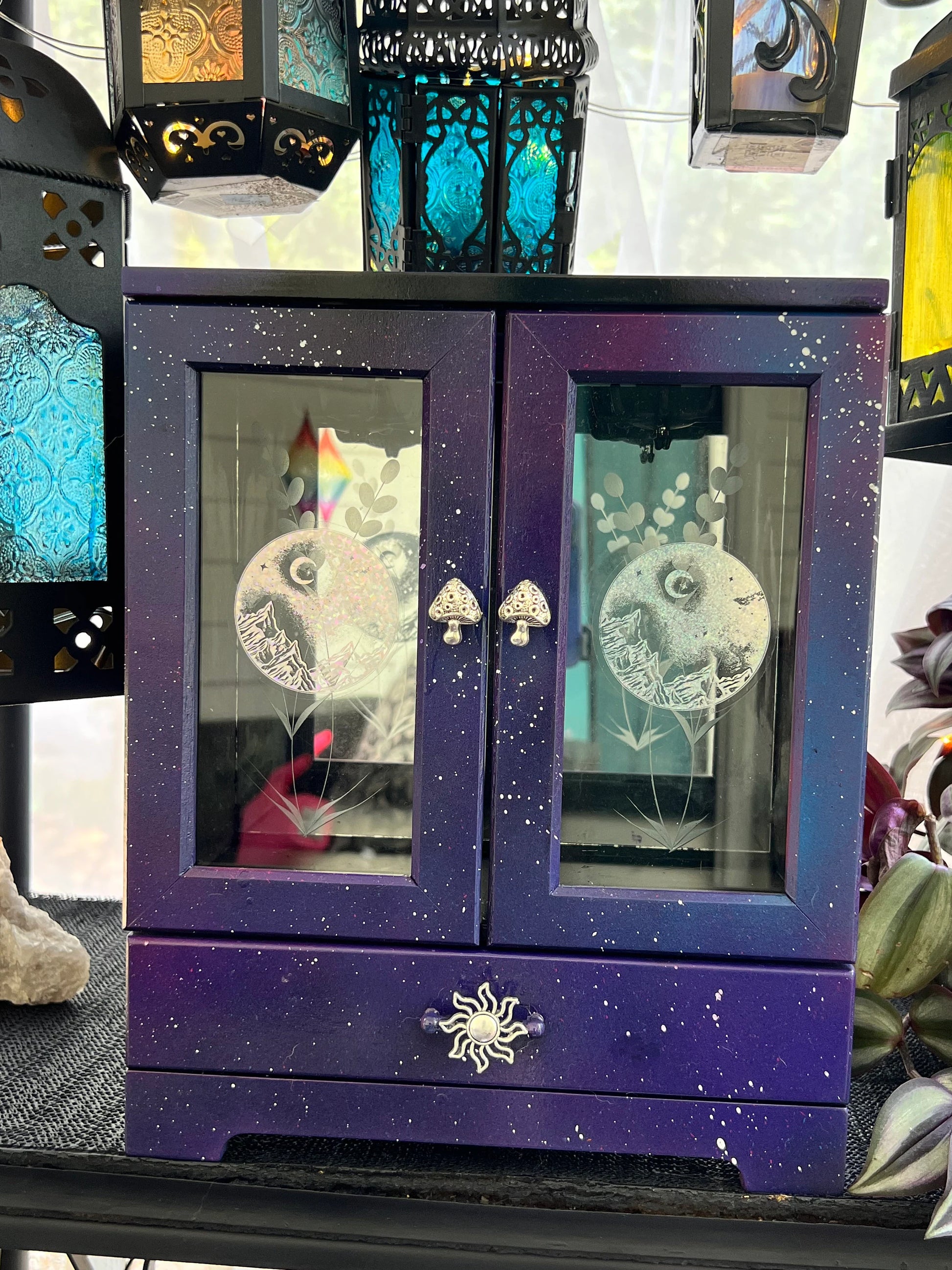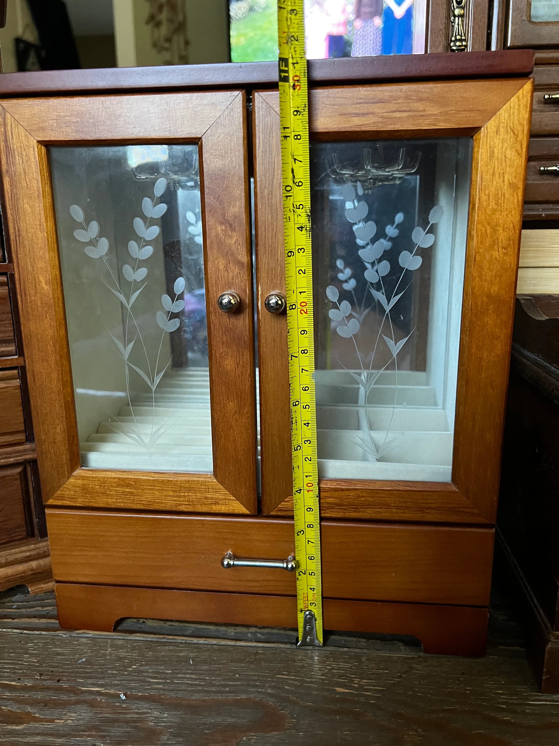 This box is cute, fair size, and holds more than you think. Featuring one slide out drawer, double glass doors, mirror back, and 2 necklace spinners. Please note, the padded ring and misc organizer from the original photo is not included, as I accidently got paint all over it. My bad.